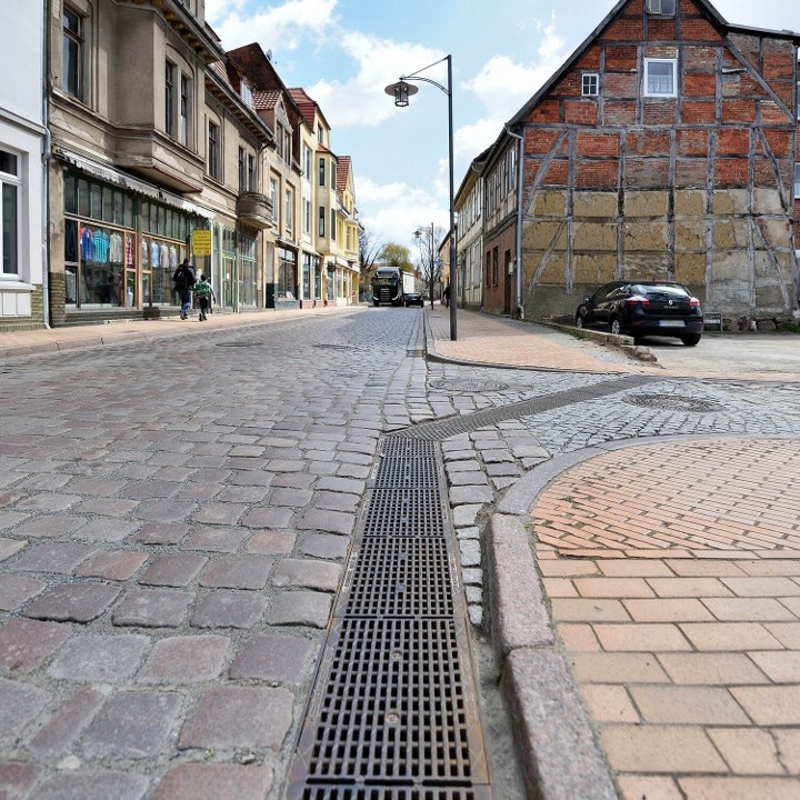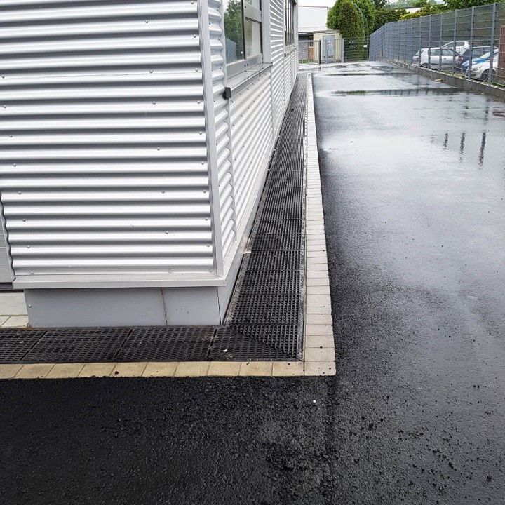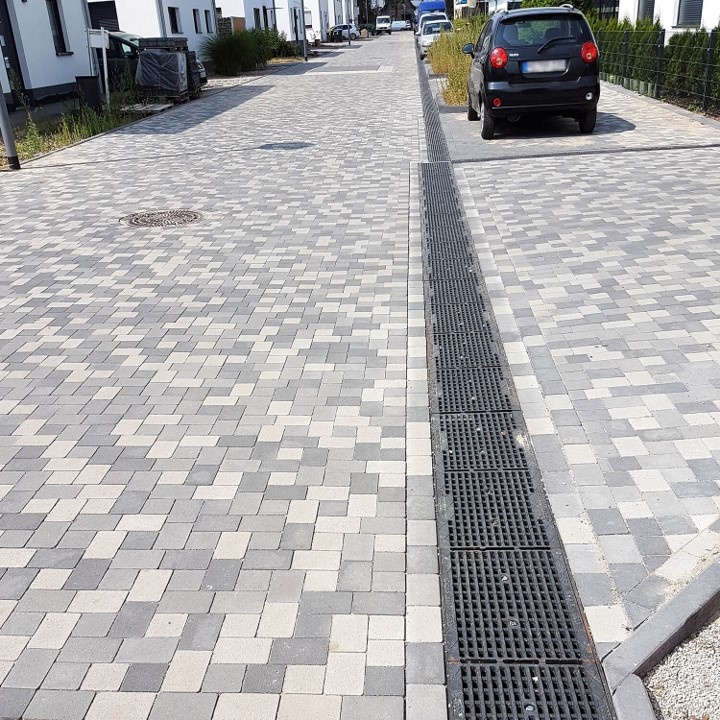 - Angrenzende Pflaster müssen unter Berücksichtigung späterer Setzungen und Setzungen 5 mm höher als die Oberfläche des Abdeckgitters bzw. Kantenschutzes verlegt werden. Es müssen geeignete Maßnahmen getroffen werden, um ein Unterspülen und Überfluten des Straßenbelags und der Dachrinnen zu verhindern.