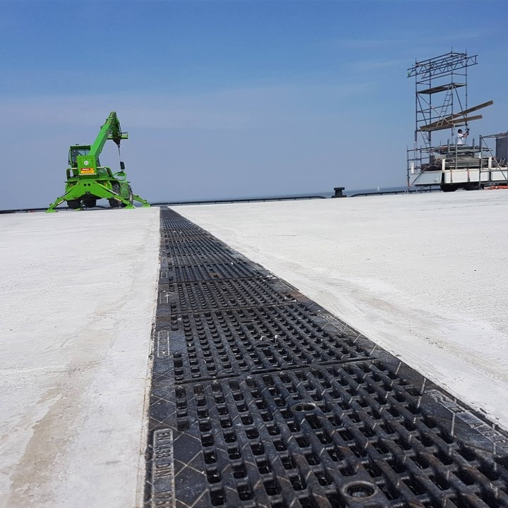Die Entwässerungsrinne MAXI PRO ist das Entwässerungssystem für höchste Anforderungen im Bereich des Güterverkehrs (Industriebereiche, Flughafenarbeitsplätze, Häfen etc.). Die Dämpfungseinlage und die spezielle Schraubverriegelung garantieren eine ruhige Lage des Untergrundes und erfüllen die hohen Sicherheitsanforderungen. Mit einer Ablaufleistung von bis zu ca. 80 l/s (Nennbreite 400 mm, Länge 1.000 mm) werden auch größere Wassermengen schnell und sicher abgeleitet.